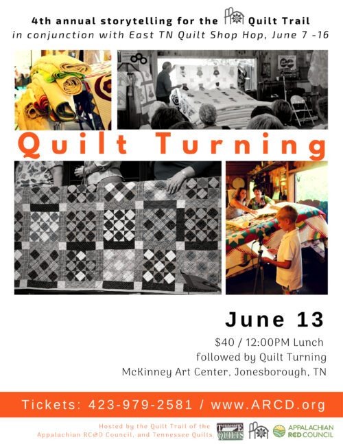 This year our 4th annual Quilt Turning for the Quilt Trail will be Wednesday June 13 in Jonesborough, TN, the storytelling capital of the world! Every quilt has a story: of the heart that designed it, the hands that stitched it, and the family who was warmed underneath it. This special community storytelling event features the antique and heirloom quilts behind the Quilt Trail, and stories told by the quilt barn owners themselves! See past events & photos: https://arcd.org/2017/07/25/quiltturningprogram2017/// https://arcd.org/2015/07/23/bed-turning-a-success/