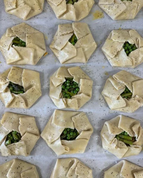 Once well chilled, turn dough out onto well floured surface and roll out between 8-9” in diameter. Egg wash edges (one egg whisked with one tbsp water) fill with fruit and fold edge over filling leaving a fruit center exposed. Egg wash outside crust and sprinkle with sugar.