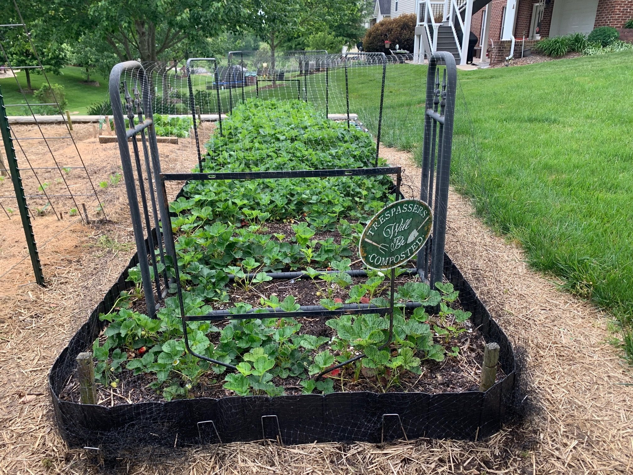 Once they have invaded the garden, pests can be very difficult to combat. Voles have been my garden’s nemesis. Because last year’s strawberry patch suffered terribly because of them as well as other critters, this year I decided to barricade my strawberry patch by surrounding it with pound-in edging to deter vole entry. I also covered the patch with netting to keep out larger furry pests and birds (photo 1). Berry harvest this year (photo 2) has been much more rewarding than last year.