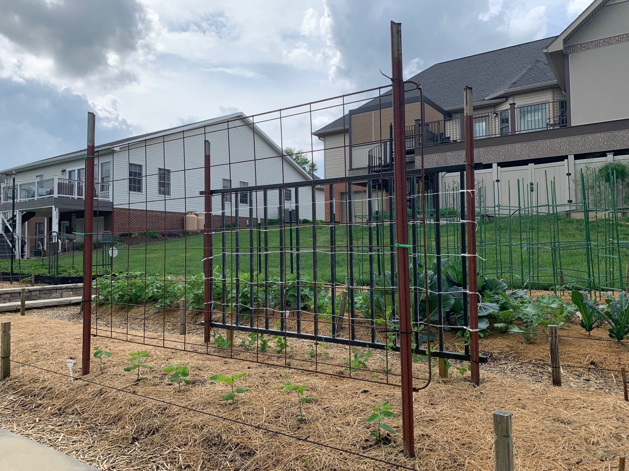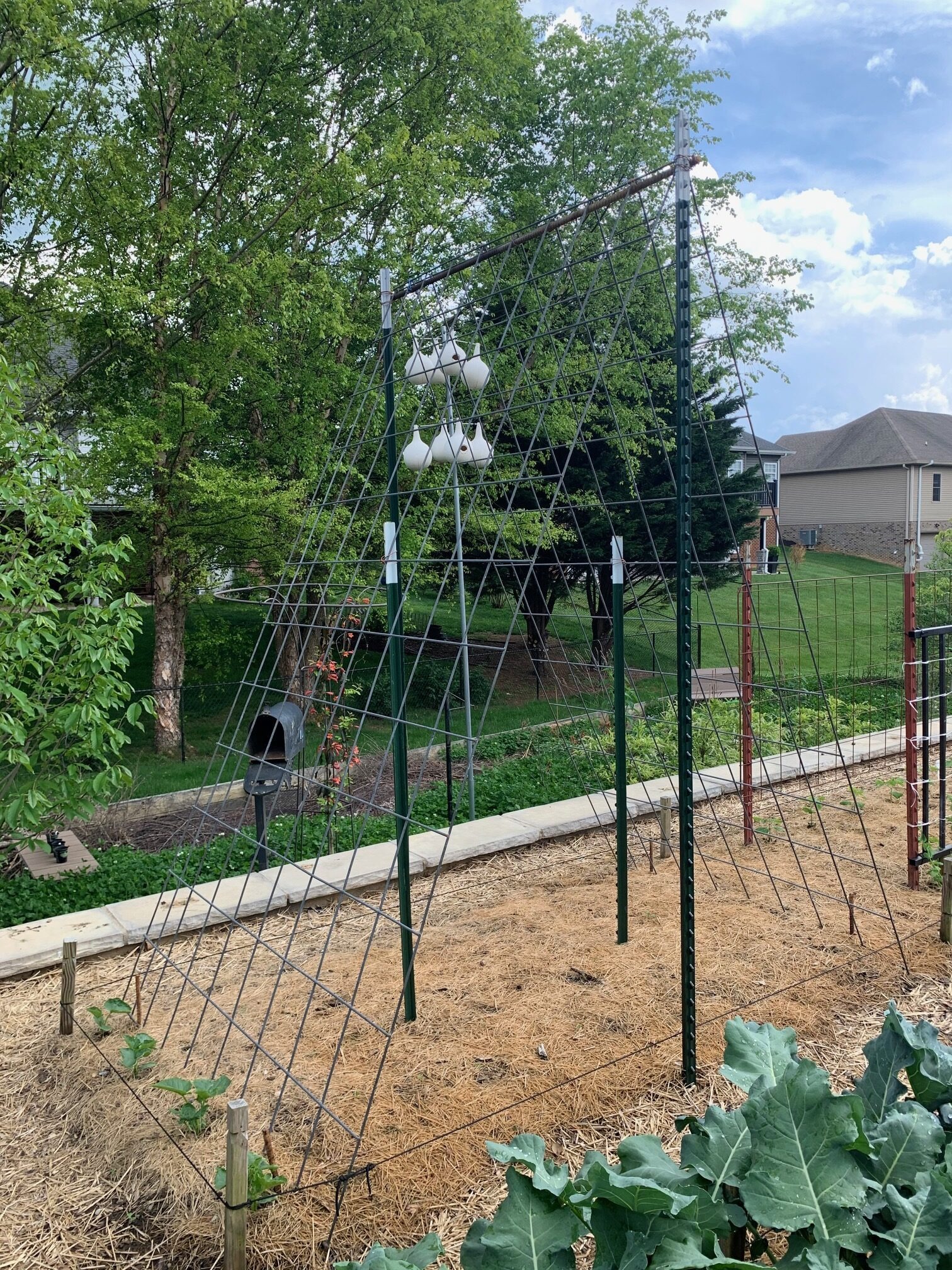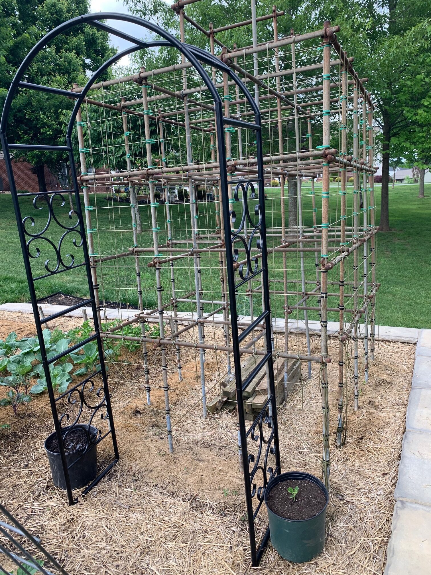 Various methods of trellising are currently the stand-out feature of my garden. One method is the use of two cattle fence panels installed in an upside-down V shape (photo 3). I’ve planted cucumbers on one pair of these panels and running butter beans on another pair. Pole beans will be growing on a repurposed jungle-gym, and cantaloupes will be climbing up an arch trellis (photo 4). Snap peas are starting to climb a leftover-from-a-deck-project fence rail, and edamame is almost tall enough to grab onto a grid that was once the underside of a twin bunkie board (photo 5).