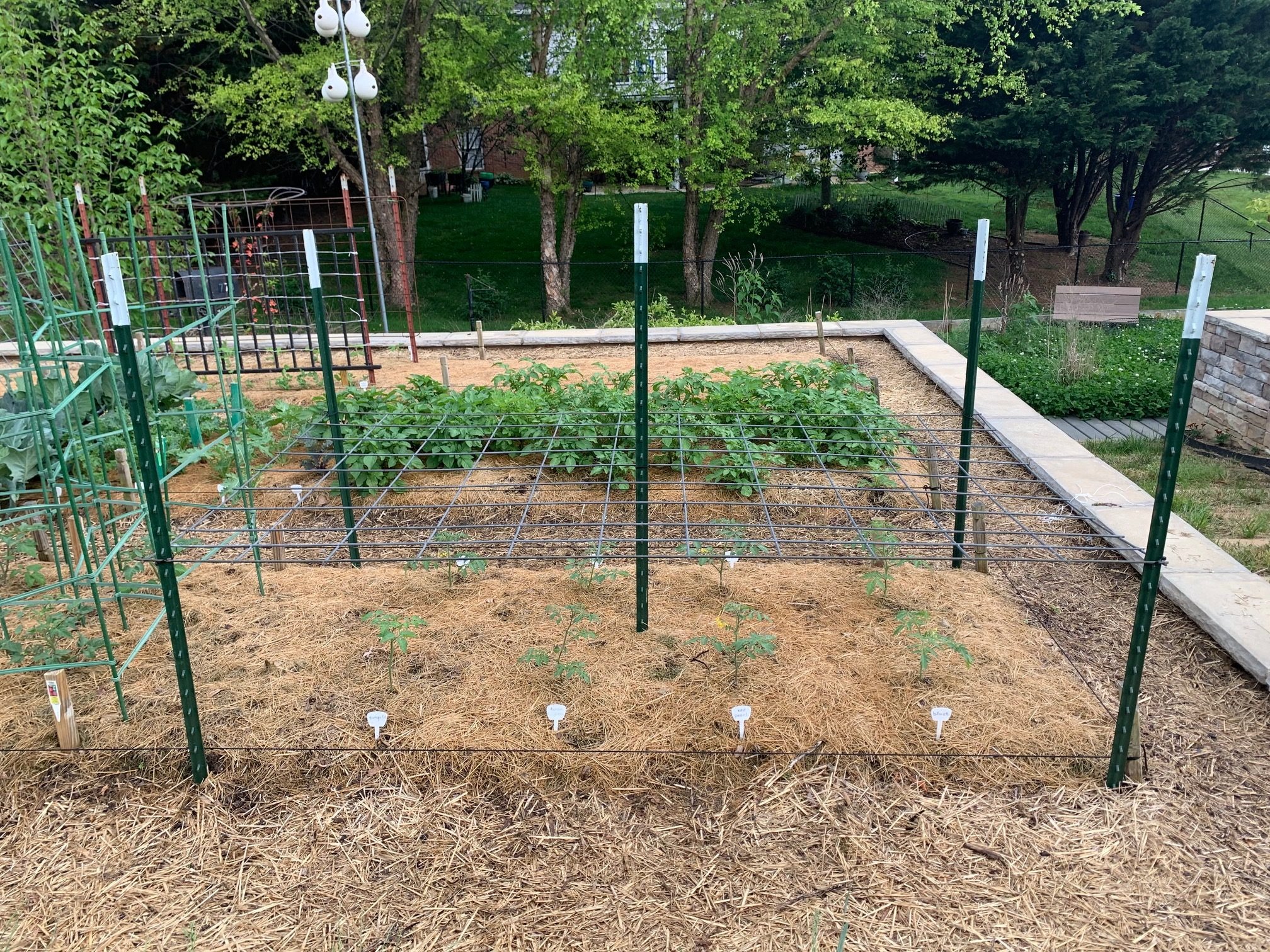 tomatoes off the ground. T-posts are in place for Florida weave trellising for some of the plants, and staking kits surround others. A new method I am trying is a cattle panel installed horizontally about two feet off the ground (photo 6). The idea is for the plants to grow up through the panel and then flop on the panel for easy harvesting. A gardener friend shared this idea with me, and I look forward to seeing if it is a method I’ll wish to repeat.