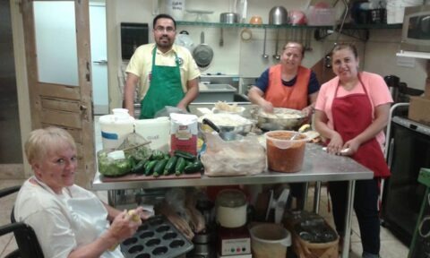 Community members preparing food in the Boone Street kitchen.