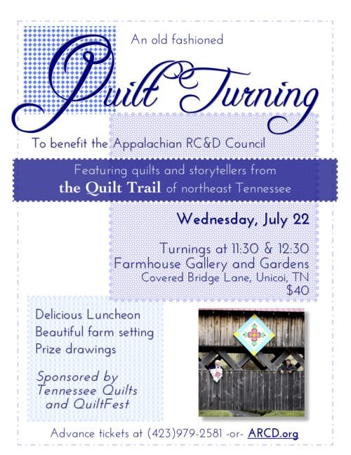 We are one week out from our Quilt Trail Bed Turning to celebrate the Quilt Trail, July 22 from 11:00AM-2:00PM. We still have tickets available ($40). The event includes two rounds of quilt storytelling (11:30AM and 12:3oPM) featuring quilts from the quilt barns told by the quilt owners themselves (see below!); a beautiful farm setting at Farmhouse Gallery and Gardens, 121 Covered Bridge Ln, Unicoi; a delicious luncheon;….did we mention quilts?? Call 423-979-2581 or reserve online.