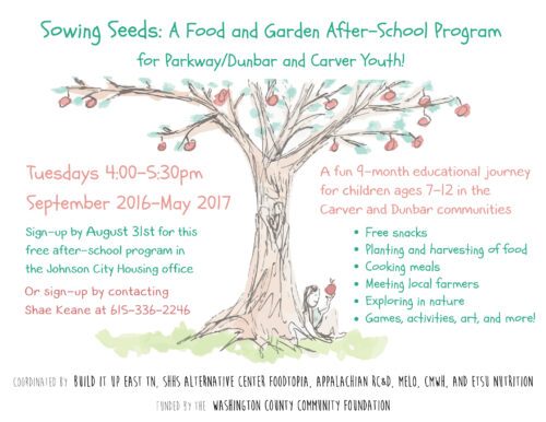 [2] Grade K-8: Shae Keane, Program Leader of Build It Up, will be creating weekly placed-based education for children ages 7-12 in the Mountain Home neighborhood (the Parkway/Dunbar and Carver Johnson City Housing communities), centered around use of the Wilson Avenue Food Forest Park, within walking distance of Carver Recreation Center. The programming will focus on food, health, and nutrition literacy, with emphasis on helping the children learn how to plant, grow, harvest, and cook their own food. Keep up with Shae and the Mountain Home Sowing Seeds program through her blog.